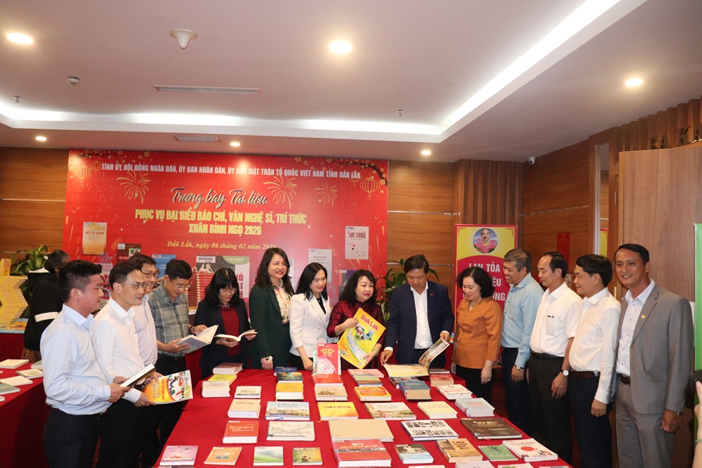 Đại biểu tham quan khu vực trưng bày sách, tài liệu của Thư viện tỉnh nhân Ngày sách và Văn hóa đọc Việt Nam năm 2025