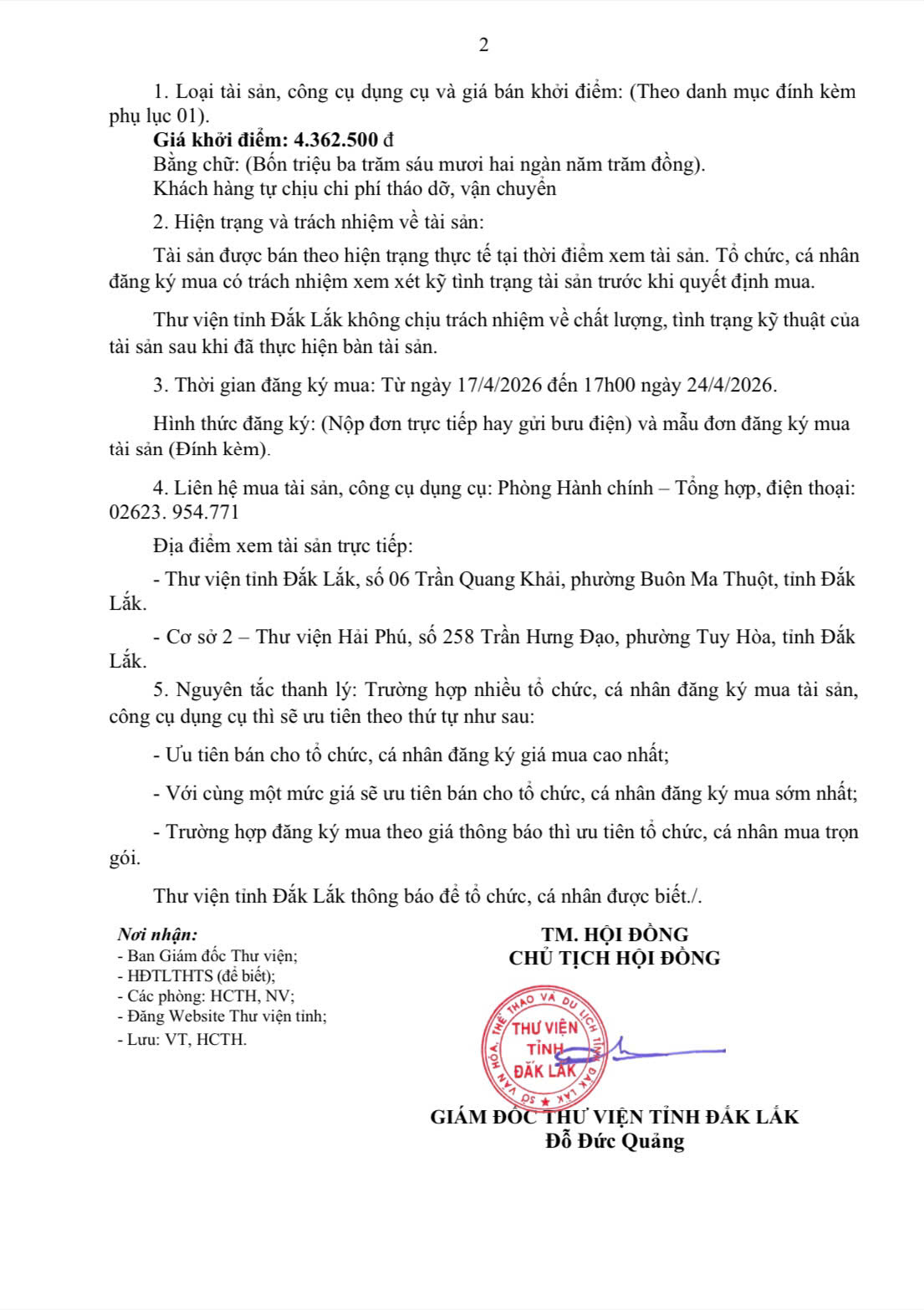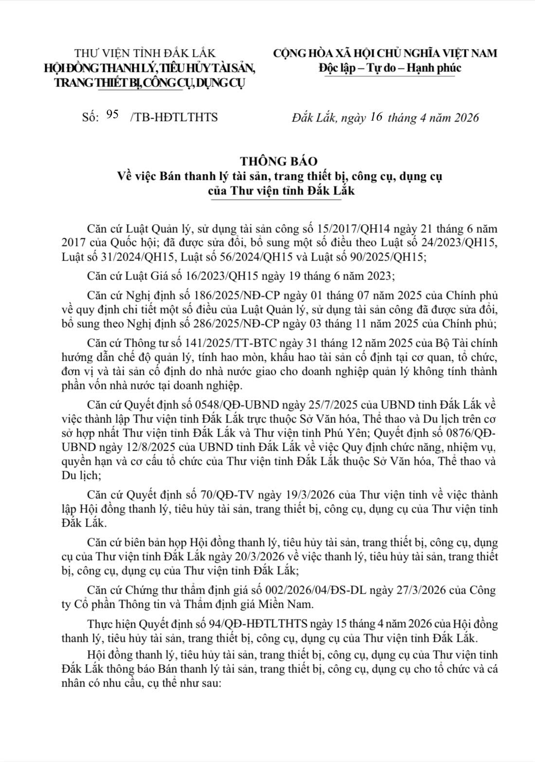 Thông báo về việc bán thanh lý tài sản, trang thiết bị, công cụ, dụng cụ của Thư viện tỉnh Đắk Lắk