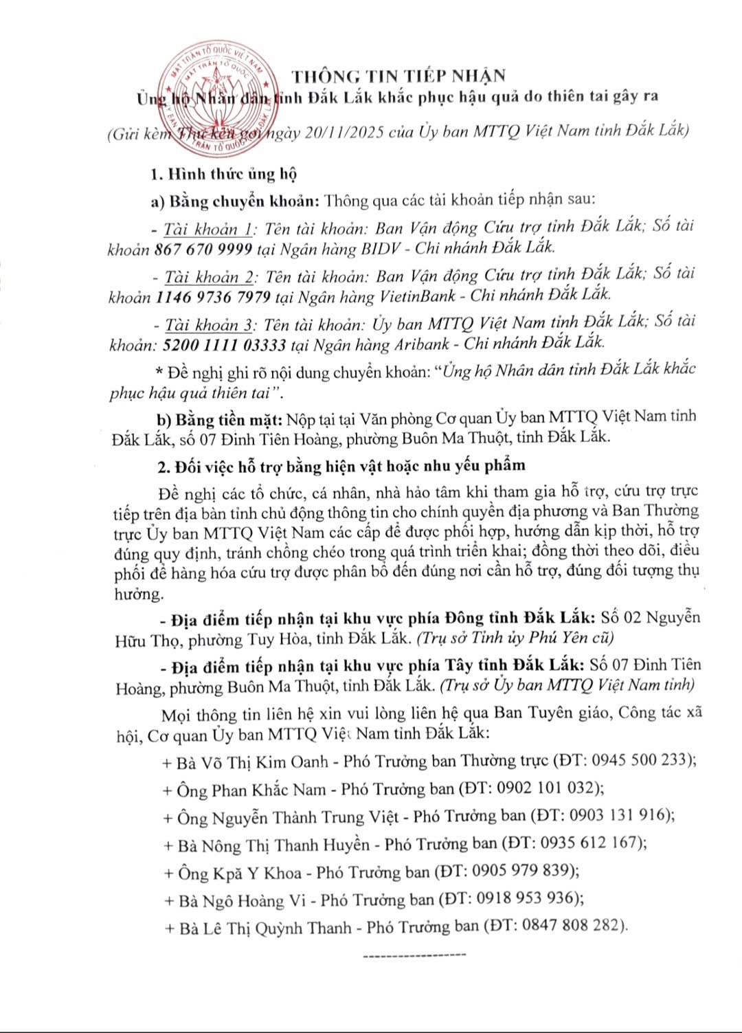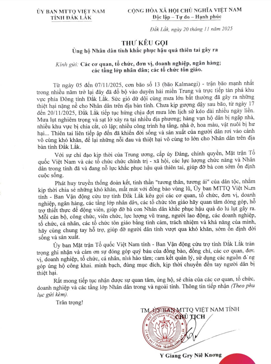 Thư kêu gọi ủng hộ nhân dân tỉnh khắc phục hậu quả thiên tai gây ra